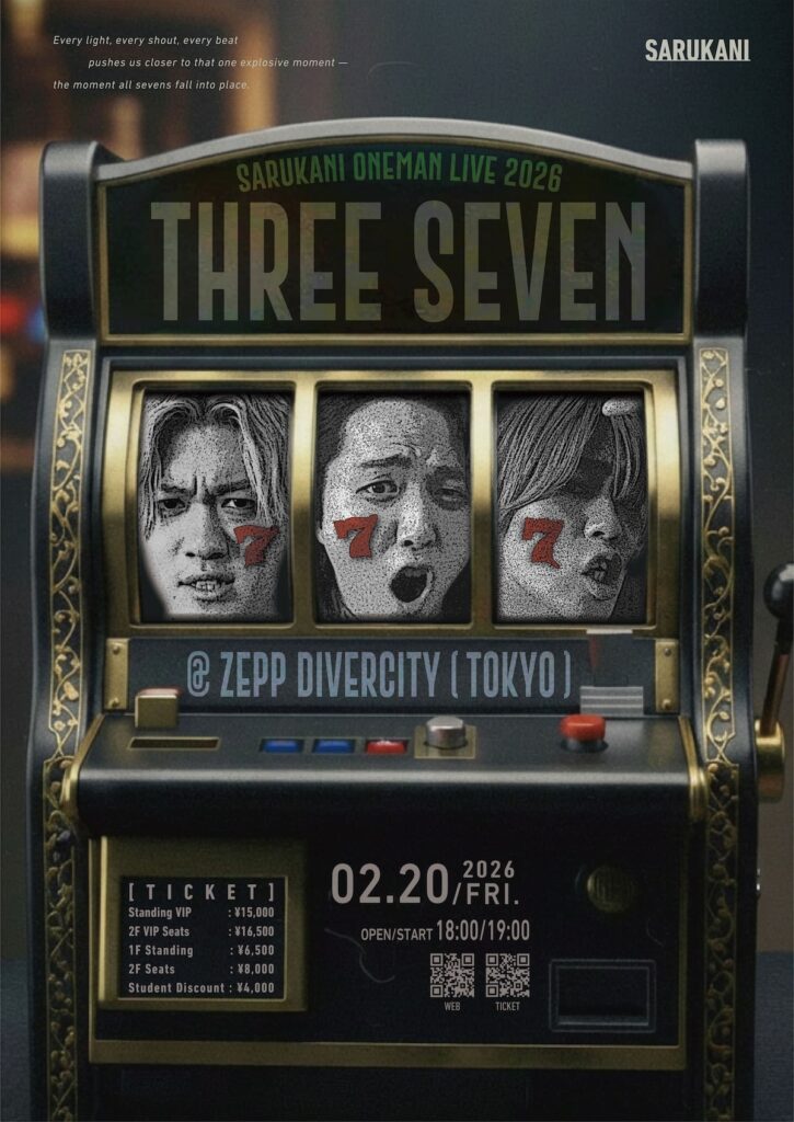2月20日(金)にZepp DiverCityで開催されるSARUKANI ONEMAN LIVE『777 -THREE SEVEN-』には“みきまりあ(NOMELON NOLEMON)”の客演も決定しており、本作を引っ提げた、エンターテイメントなショーが期待される。